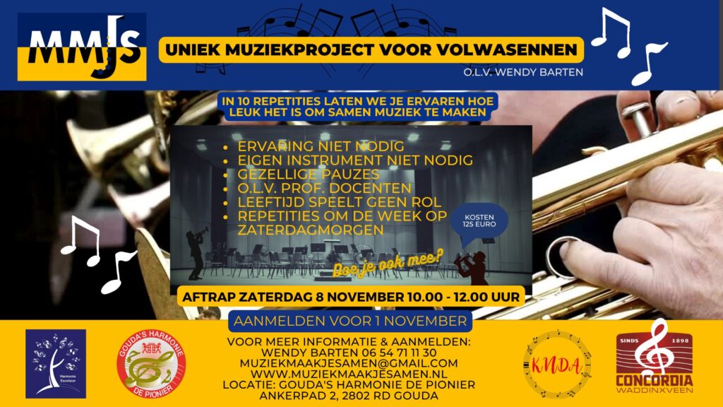 Gisteren vond de eerste les van het nieuwe seizoen van Muziek Maak Je Samen voor Volwassenen plaats. Er waren maar liefst 38 deelnemers die zonder ervaring een nieuw instrument zijn komen leren. Zou het je leuk lijken kan je voor komende zaterdag (15 november) nog instromen. Je kan je nog aanmelden via de website van MMJS!
